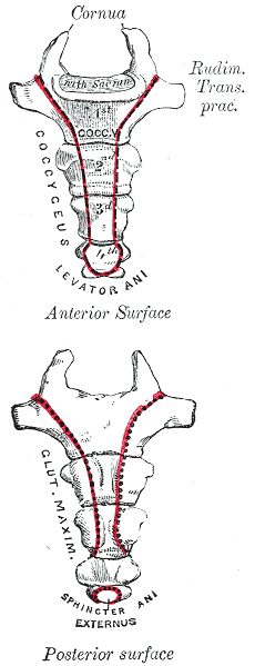 4 coccígeas (sin articulación entre ellas pues están fundidas y componen el hueso llamado cóccix. Tampoco existe articulación entre el sacro y el cóccix; según teorías evolutivas sería la reminiscencia del rabo o cola correspondiente a otras especies animales).